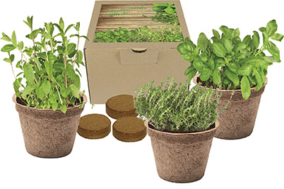 Beschreibung: Drei ökologisch abbaubare Töpfe mit den typischen Kräutersamen für die italienische Küche: Basilikum, Majoran und Thymian. Der Werbedruck erfolgt auf dem Deckel-Etikett. Auch eine Gestaltung des Etiketts ist bereits ab 250 Stück möglich.