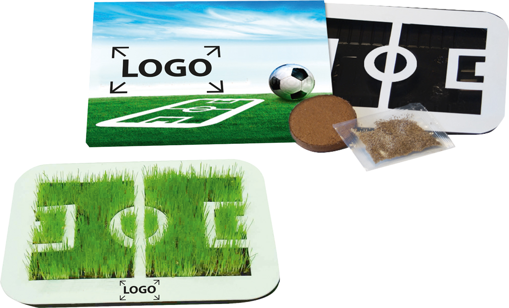 Beschreibung: Die Wachstumsschale enthält alles für die Anzucht der Pflanzen: Erdtablette, Samen und Spielfeld-Schablone. Schon auf der umlaufenden Schuber-Rückseite lesen Sie die einfache Handhabung für das wachsende Fußballfeld Bald sprießt der grüne Rasen. Eigenes Logo der Schablone ab 1.000 Stück.