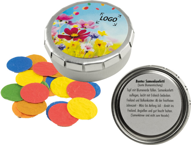 Beschreibung: Buntes Samenkonfetti handlich verpackt. Die formschöne Dose ist ein sympathisches Giveaway, das gerne angenommen wird. Ein Werbeeindruck oder eine individuelle Gestaltung des Etiketts ist bereits ab 250 Stück möglich.