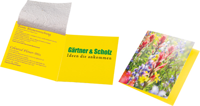 Beschreibung: Natur pur mit dem Samenpapier im Klappkärtchen. Besonders flach für Ihre Beilage. Zur Anzucht das Samenpapier entnehmen und direkt auf das Erdreich legen, mit etwas Erde bedecken und feucht halten. Aus dem Samenpapier sprießen bald die ersten Keimlinge. Druck in das Standardmotiv der Karte oder auch eine eigene Gestaltung, jeweils ab 250 Stück.