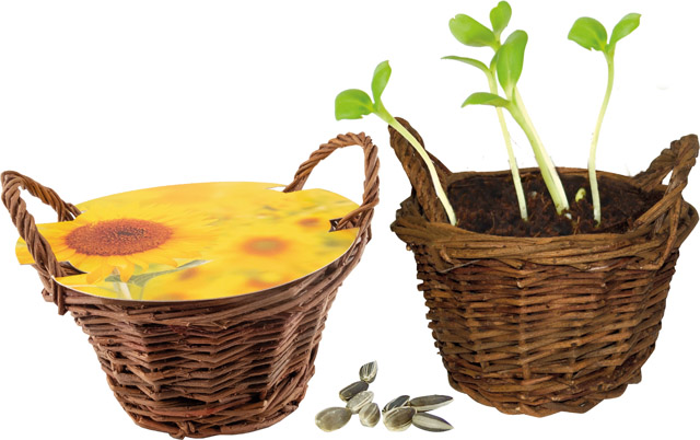 Beschreibung: Alles für das direkte Wachstum der Pflanzen aus dem Korb. Im Natur-Weidenkörbchen mit Henkel sind Erde, Pflanzanleitung und Samen eingelegt. Werbeaufdruck auf dem Standardmotiv oder eine eigene Gestaltung der Abdeckung, jeweils ab 250 Stück.