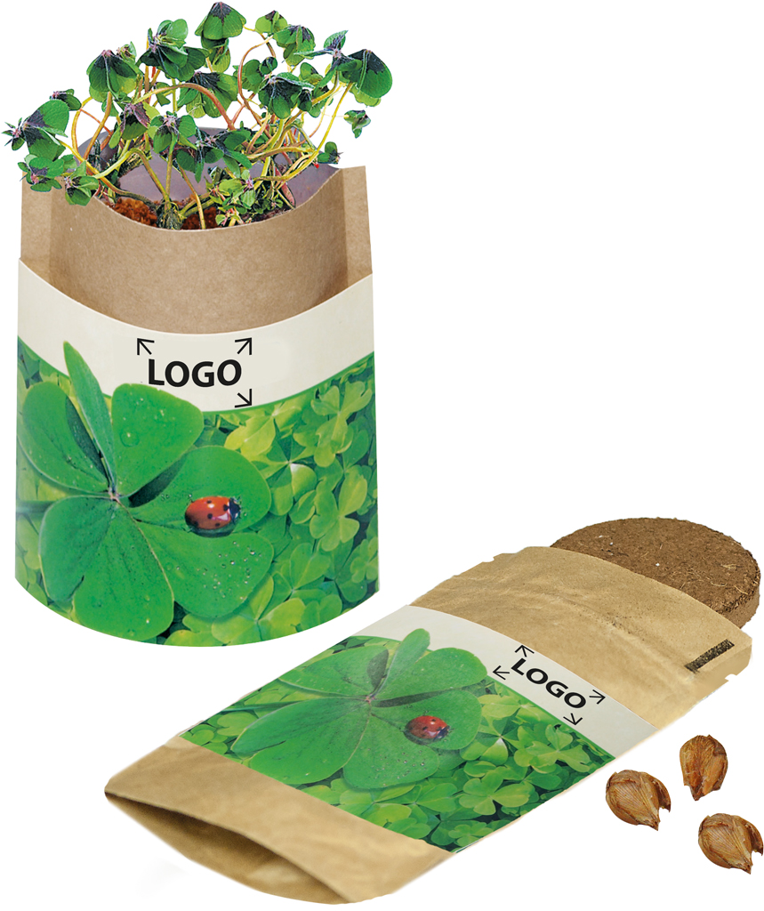 Beschreibung: Natur-Bag, der kleine Garten aus der Tüte. Öffnen, Erdtablette quellen lassen und das Saatgut einsäen. Die Naturtüte fängt durch die Innenkaschierung die Feuchtigkeit auf. Die umlaufende Banderole ist während der Wachstumsphase der Pflanzen stets im Blickfeld. Werbeaufdruck auf dem Standardmotiv der Banderole oder eine eigene Gestaltung, jeweils bereits ab 250 Stück.