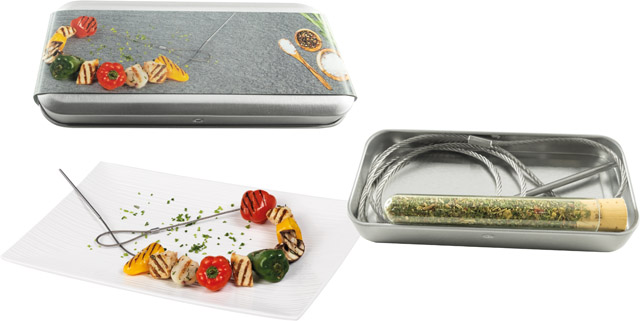Beschreibung: Edel und nachhaltig sind sowohl die Dose als auch unser Edelstahl-Grilldraht. Sie sind wiederverwendbar und auch optisch ein Blickfang. Zum Marinieren der Grillstücke werden Grillkräuter mitgeliefert. Die Banderole bietet viel Platz für Ihre Werbebotschaft oder, ebenfalls ab 250 Stück, für Ihre individuelle Gestaltung.
