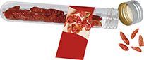 Beschreibung: Die getrockneten Chili-Schoten schärfen nicht nur die Sicht, sondern auch die Werbeaussage. Der Werbedruck erfolgt auf dem Standardmotiv oder eine eigene Gestaltung des Fähnchens, jeweils bereits ab 250 Stück möglich.