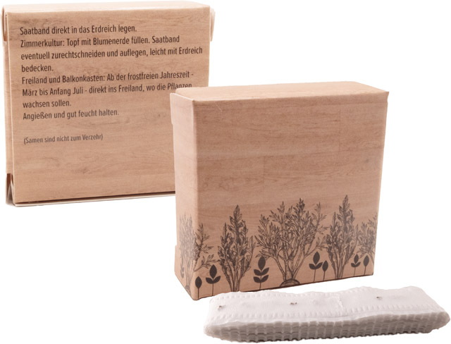 Beschreibung: Meter für Meter gesundes Gemüse. Ein sympathisches Giveaway für Ihre Kunden. Das Saatband einfach auf Blumenerde setzen und wässern. Schon bald zeigen sich die ersten grünen Spitzen. Auf dem Standardmotiv der Packung ist Platz für Ihren Werbeeindruck. Eine eigene Gestaltung ist ebenfalls bereits ab 250 Stück umsetzbar.
