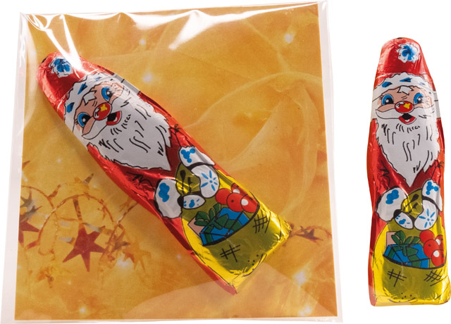 Beschreibung: Über diese kleine Aufmerksamkeit freuen sich Ihre Kunden in der Weihnachtszeit. Der Weihnachtsmann aus Edelvollmilchschokolade ist ideal zum Überreichen. Die Karte kann im Standardmotiv mit Ihrem Logo versehen werden oder, ebenfalls ab 250 Stück, komplett personalisiert werden.