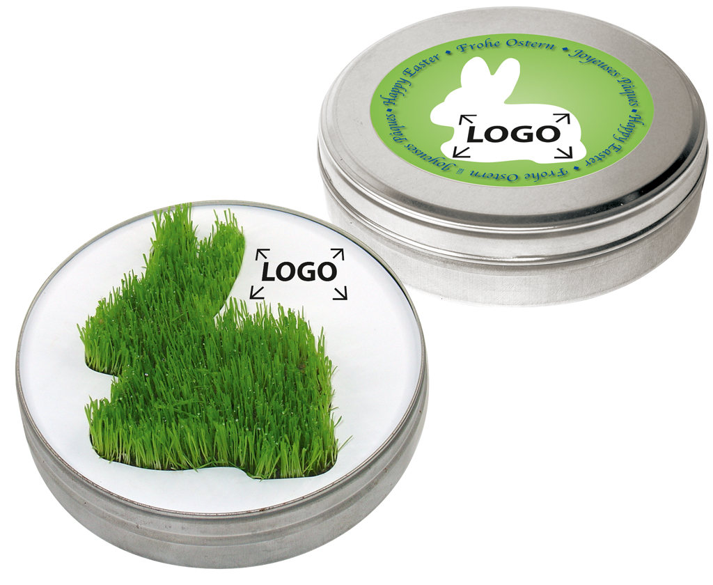 Beschreibung: Metalldose mit rasendem Hasen. Ein Rasen-Osternest in Hasenkontur. Dose öffnen, den Inhalt nach Anleitung ansäen und nach kurzer Zeit ist der wachsende Hase grün. Den Rasenschnitt vornehmen, damit die Konturen gut sichtbar bleiben. Eigenes Logo der Wachstumsschablone ab 1.000 Stück auf Anfrage möglich. Der Deckelaufkleber bietet Platz für Ihren Werbeeindruck oder die eigene Gestaltung ab 250 Stück.