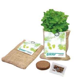 Beschreibung: Ein Glücksbringer mit dem Natursäckchen. Suchen Sie Ihr Glück aus dem Jutesäckchen. Die Handhabung ist auf dem Kärtchen zu finden. Ein flacher Naturartikel, der durch das Wachstum zum Pflanzbeutel wird. Mit dem Kärtchen die Werbebotschaft auf der Vorderseite anheften, dadurch ist sie ständig im Blickfeld. Platz für Ihren Eindruck ist auf dem Standardmotiv oder alternativ Ihre eigene Gestaltung des Kärtchens, jeweils ab 250 Stück.
