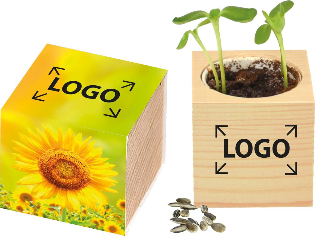 Beschreibung: Ein nachhaltiger und naturiger Werbeträger für Ihre Aktion. Mit dem eingelegten Becher, der Erdtablette und den Samen der Zwergsonnenblume ist der Holzwürfel ein attraktiver Blickfänger auf dem Schreibtisch. Der Werbedruck erfolgt auf der Banderole oder direkt auf dem Holzwürfel. Eine eigene Gestaltung der Banderole ist bereits ab 250 Stück möglich.