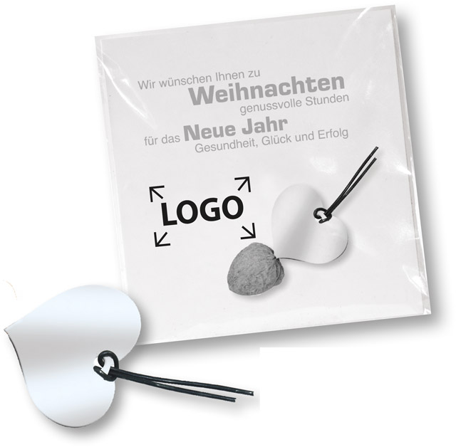 Beschreibung: Ein nützliches Design-Objekt für den täglichen Gebrauch. In der Winterzeit und zu Weihnachten kommt dieser Nussknacker aus Edelstahl zum Einsatz. Zusammen mit einem Grußkärtchen ist dieser Artikel praktisch in einer Tüte verpackt (ohne Nuss). Platz für die Werbefläche ist auf dem Standdardmotiv des Kärtchens oder eine eigene Gestaltung, jeweils ab 250 Stück.