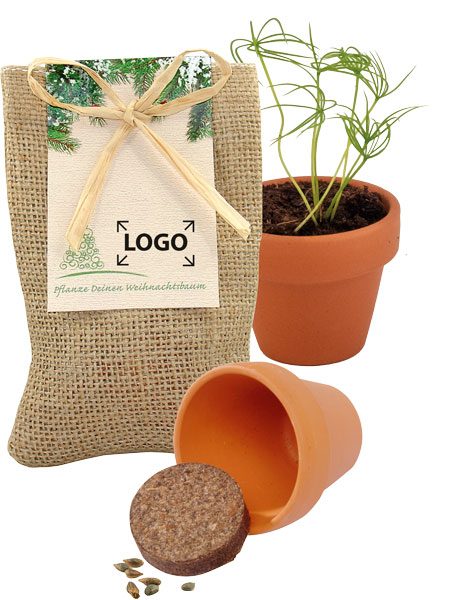 Beschreibung: Ein Stück Natur beinhaltet dieses kleine Jutesäckchen. Neben der Pflanzanleitung ist alles dabei für die Anzucht einer kleinen Fichte-Pflanze: Tontopf 4 cm, Samen und Erdtablette. Platz für den Werbedruck ist auf dem Standardmotiv des Headers oder eine eigene Gestaltung, jeweils bereits ab 250 Stück.