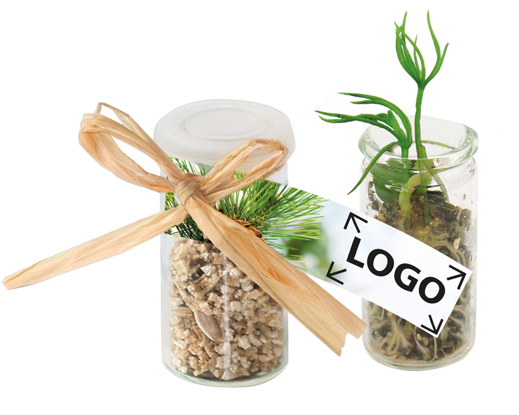 Beschreibung: Ein Gewächshaus im Miniaturformat, das auch auf dem Schreibtisch oder auf der Fensterbank stehen kann. Im Gläschen ist bereits das Wachstumsgranulat mit den Samenkörnern enthalten. Auf der Anhängekarte ist die Anleitung bereits aufgedruckt. Auf der Vorderseite ist ausreichend Platz für Ihren Werbeeindruck. Auch eine eigene Gestaltung ist ab 250 Stück möglich.