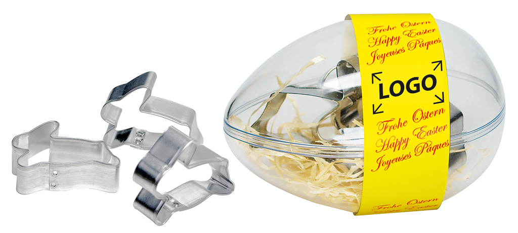 Beschreibung: Osterzeit ist Back-Zeit. Drei Weißblech-Ausstechform in Hasen-Form, eingelegt in transparentem Ei. Ein Backrezept befindet sich auf der Banderole aufgedruckt. Hier ist auch Platz für den Werbeaufdruck. Auch eine eigene Gestaltungnder Banderole kann ab 250 Stück erfolgen.