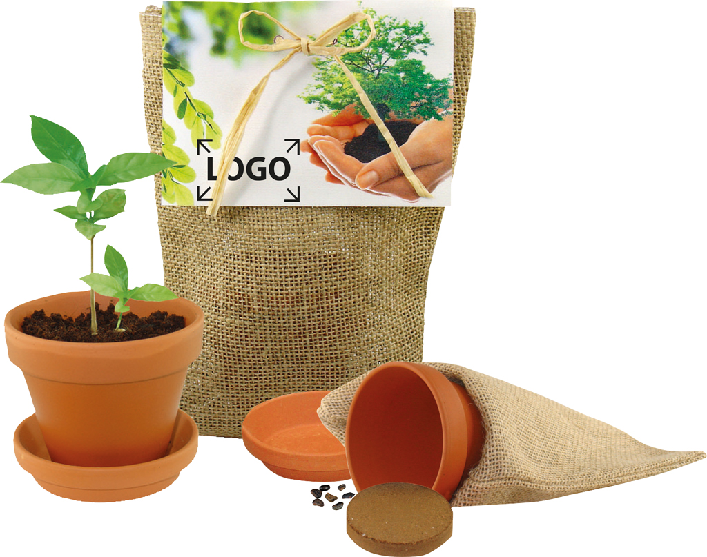 Beschreibung: Ein Stück Natur im Jutesäckchen mit Tontopf und Unterteller, Erdtablette und Baumsamen. Die Robinie wird gerne an Straßenrändern gepflanzt, da sie sich günstig auf die CO2-Emission auswirkt. Ein sehr robuster und widerstandsfähiger Baum, mit weißen Blütentrauben und einer lichten Krone. In der ersten Wachstumsphase ist die Robinie als Pflanze für den Balkonkasten oder Kübel gut geeignet. Schnelles Wachstum, im ersten Jahr ca. 20-30 cm. Ausgewachsen ist die Robinie nach 50 Jahren und kann eine Höhe von ca. 30 m erreichen. Für den Werbeaufdruck ist Platz auf dem Standardmotiv im Header oder eine eigene Gestaltung des Headers, jeweils ab 250 Stück.