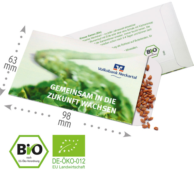 Beschreibung: Samentüte als geklebte Papiertüte im Format 63 x 98 mm mit Bio Kressesamen. Druck in das Standardmmotiv oder eine eigene Gestaltung nach Ihren Wünschen ab 1.000 Stück. Weitere Bio-Samen auf Anfrage möglich.