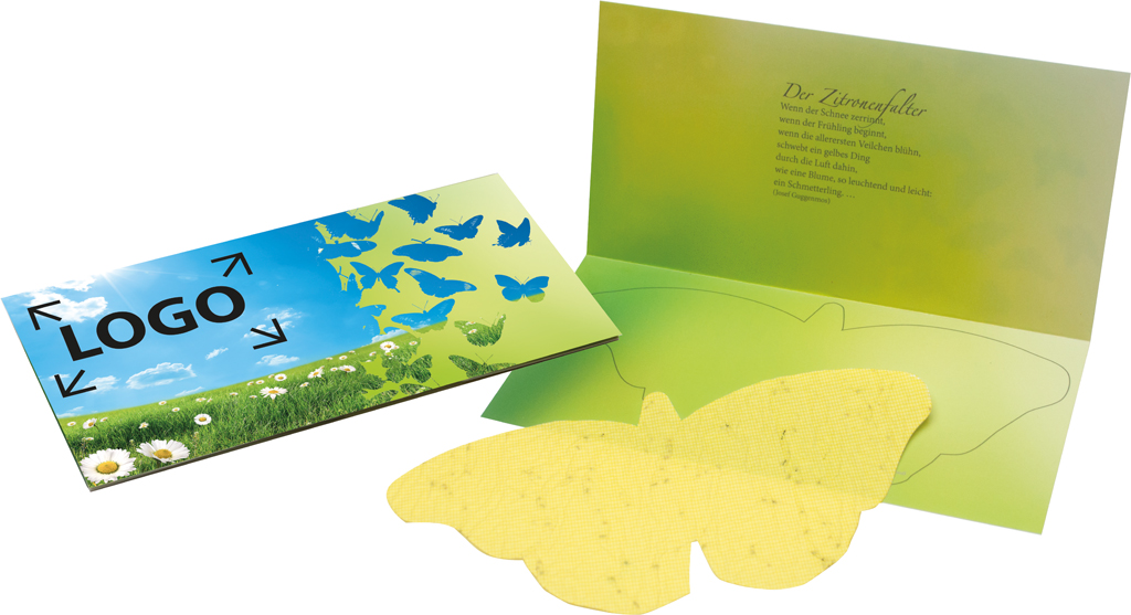 Beschreibung: Der Schmetterling enthält bereits Samen für eine Blumenwiese. Einfach auf das Erdreich legen, mit etwas Erde bedecken und gießen. Schon nach wenigen Tagen sprießen die ersten Keimlinge. Das Standardmotiv der Klappkarte bietet viel Platz für den Werbeeindruck ab 250 Stück. Eine eigene Gestaltung der Karte ist bereits ab einer Bestellmenge von 250 Stück möglich. Ein Kuvert ist separat erhältlich, Artikel 6101