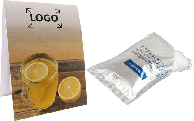 Beschreibung: Nach einem Spaziergang im Schnee oder um einer Erkältung in der kalten Jahreszeit vorzubeugen ist ein Glas heiße Zitrone genau das Richtige. Schnell und unkompliziert mit heißem Wasser angerührt. Für Ihren Werbeeindruck gibt es ausreichend Platz auf dem Standardmotiv der Karte oder, ebenfalls ab 250 Stück, für eine eigene Gestaltung.
