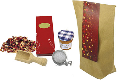 Beschreibung: Unsere neue Geschenktüte enthält alles für die Zubereitung eines wohlschmeckenden Tees: ca. 50 g Weihnachts-Früchtetee, Tee-Ball und 30 g Honig sowie eine kleine Holzschaufel (7 cm) zum Entnehmen des Tees. Ein Klassiker für den Tee-Liebhaber. Der Werbedruck erfolgt auf dem Standardmotiv der Karte oder eine eigene Gestaltung, jeweils ab 100 Stück.