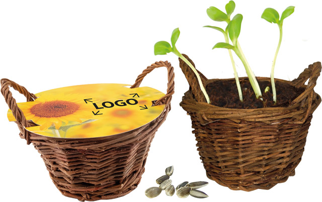 Beschreibung: Alles für das direkte Wachstum der Pflanzen aus dem Korb. Im Natur-Weidenkörbchen mit Henkel sind Erde, Pflanzanleitung und Samen eingelegt. Werbeaufdruck auf dem Standardmotiv oder eine eigene Gestaltung der Abdeckung, jeweils ab 250 Stück.