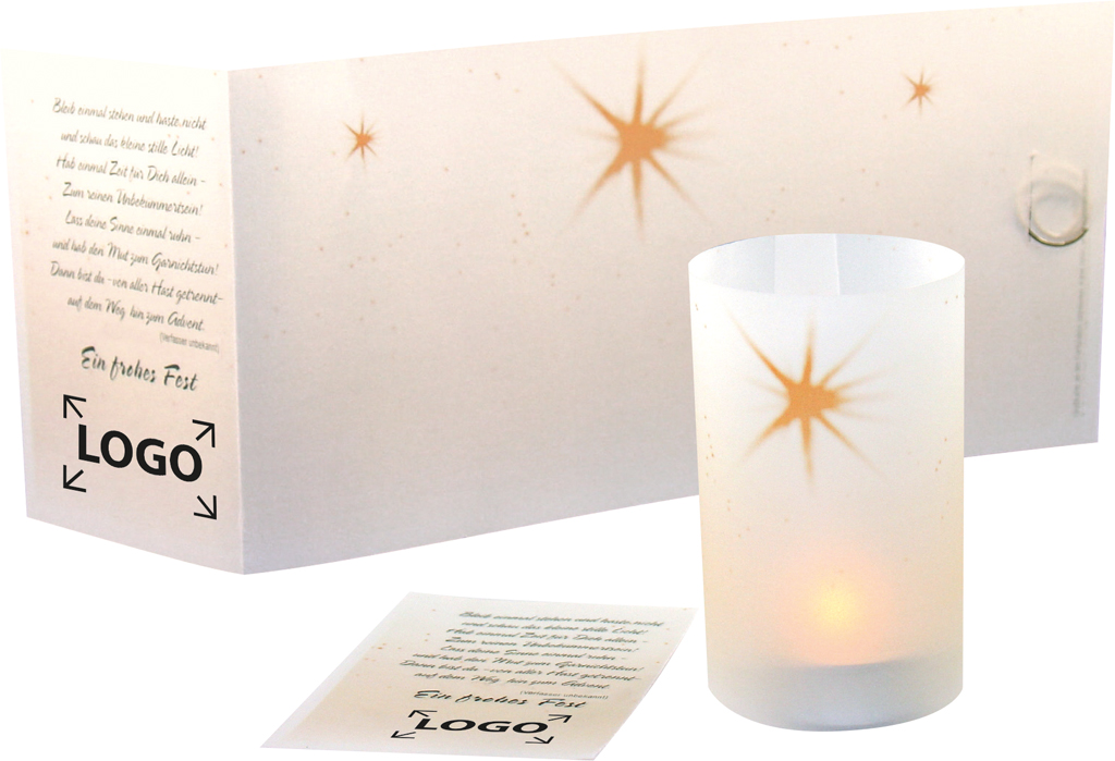 Beschreibung: Diese Weihnachtskarte wird nachhaltig genutz. Nach dem Weihnachtsgruß wird sie einfach zusammengerollt und schmückt zusammen mit einem Teelicht jeden Raum (ohne Teelicht). Platz für den Werbedruck ist auf den Standardmotiven der Karte (Grußcoupon und Lichtrollenteil) oder eine eigene Gestaltung der Karte, jeweils ab 100 Stück. Ein Kuvert ist separat erhältlich Art. 6101