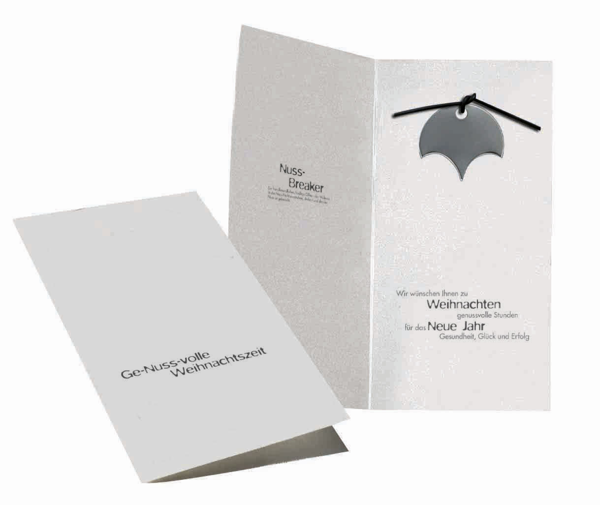 Beschreibung: Diese edle Weihnachtskarte enthält einen Edelstahl-Nussbreaker, der in der Winterzeit immer wieder zum Einsatz kommt (ohne Nuss). Platz für den Werbedruck ist auf dem Standardmotiv der Karte oder eine eigene Gestaltung, jeweils ab 100 Stück. Ein Kuvert ist separat erhältlich Art. 6101.