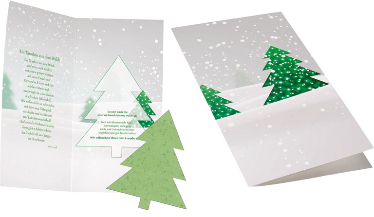 Beschreibung: Der Tannenbaum enthält bereits Fichtensamen. Einfach auf das Erdreich legen, mit etwas Erde bedecken und gießen. Schon nach wenigen Tagen sprießen die ersten Keimlinge. Ab 100 Stück ist Ihre Werbebotschaft auf dem Standardmotiv oder die individuelle Gestaltung der Karte möglich. Ein Kuvert ist separat erhältlich, Artikel 6101