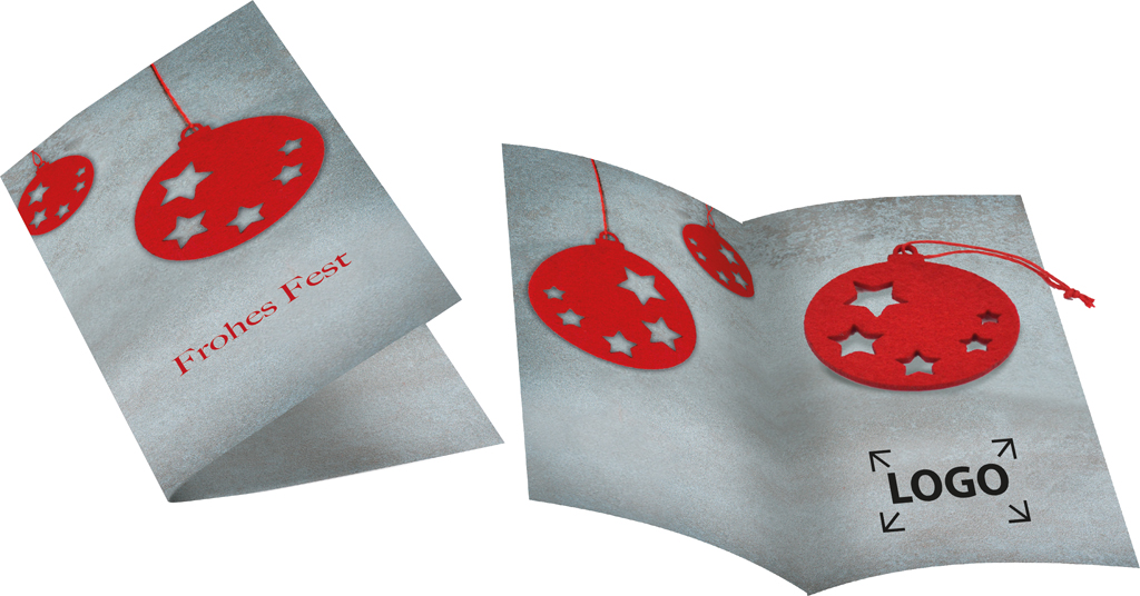 Beschreibung: Eine Weihnachtskarte mit einer Weihnachtskugel aus rotem Filz (ca. Ø 6,9 cm), inklusive Aufhänger. Platz für den Werbedruck ist auf dem Standardmotiv oder eine eigene Gestaltung der Karte, jeweils bereits ab 100 Stück. Ein Kuvert ist separat erhältlich, Artikel 6101