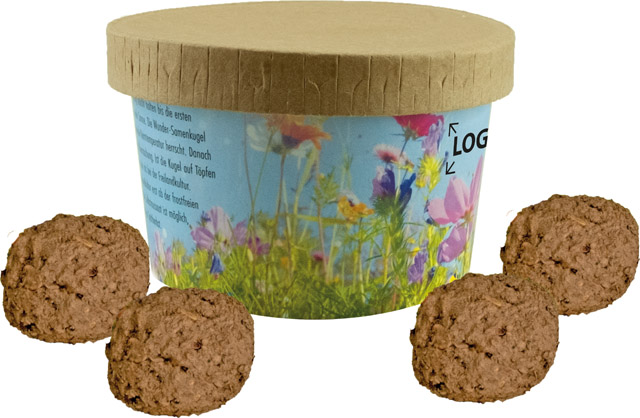 Beschreibung: Der nachhaltige Becher enthält vier Wonder Balls. Die handgefertigten und mit Samen gefüllten Tonkugeln einfach auf Blumenerde legen und wässern. Es dauert nicht lange bis es anfängt zu sprießen. Die Banderole kann mit Ihrem Eindruck versehen oder, ebenfalls ab 250 Stück, individuell gestaltet werden.