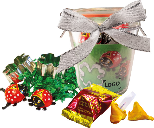 Beschreibung: Das Glücksglas garantiert einen sympathischen Jahresabschluss und einen gelungenen Start in das Neue Jahr. Das Weckglas enthält einen Glückskeks, 2 Ausstechformen Kleeblatt und 2 Glückskäfer aus Schokolade. Platz für den Werbedruck ist auf dem Standardmotiv des Einlegers oder eine eigene Gestaltung, jeweils ab 100 Stück.