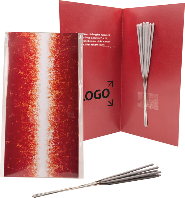 Beschreibung: Nicht nur bei Kindern, sondern auch bei Erwachsenen sind Wunderkerzen beliebt. Die Weihnachtskarte enthält 10 Wunderkerzen (ca. 170 mm) in transparenter Hülle, die beliebig eingesetzt werden können: als Deko, zu Silvester, etc. Platz für den Werbedruck ist auf dem Standardmotiv der Karte oder eine eigene Gestaltung, jeweils ab 10 Stück.