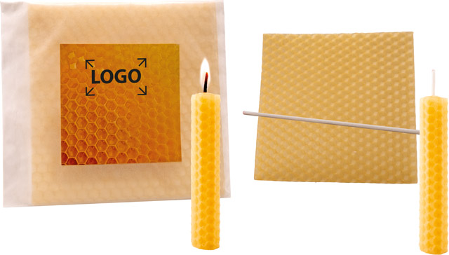 Beschreibung: Kerzen aus Bienenwachs sind nachhaltig und haben einen angenehmen natürlichen Duft. Einfach die Bienenwachsplatte rollen und den Docht einlegen, schon ist das kleine Bienenlicht fertig. Der Werbedruck erfolgt auf dem Standardmotiv des Etiketts oder eine eigene Gestaltung, jeweils ab 100 Stück.