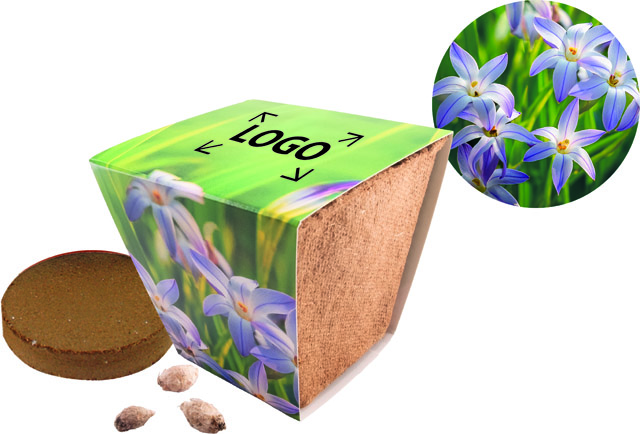 Inhalt: Kokosfaser-Topf, Erdtablette, Samen: Sternblumenzwiebelchen