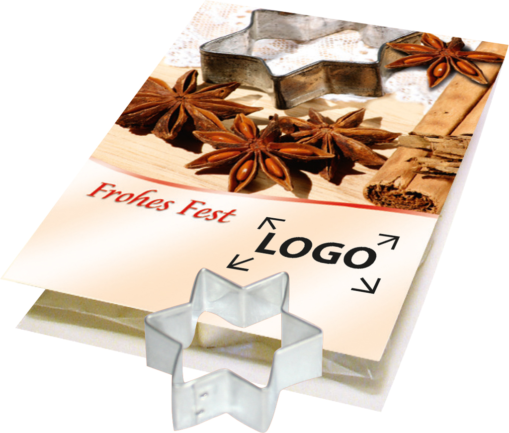 Beschreibung: Ein nettes und nützliches Giveaway für die Adventszeit und zu Weihnachten. Dieses kleine Kärtchen beinhaltet eine Stern-Ausstechform, die jedes Jahr wieder verwendet werden kann. Ein passendes Rezept befindet sich auf der Rückseite der Karte. Platz für den Werbedruck ist auf dem Standardmotiv der Karte oder eine eigene Gestaltung des Kärtchens, jeweils bereits ab 250 Stück.