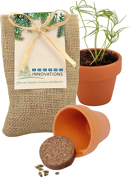 Beschreibung: Ein Stück Natur beinhaltet dieses kleine Jutesäckchen. Neben der Pflanzanleitung ist alles dabei für die Anzucht einer kleinen Fichte-Pflanze: Tontopf 4 cm, Samen und Erdtablette. Platz für den Werbedruck ist auf dem Standardmotiv des Headers oder eine eigene Gestaltung, jeweils bereits ab 250 Stück.