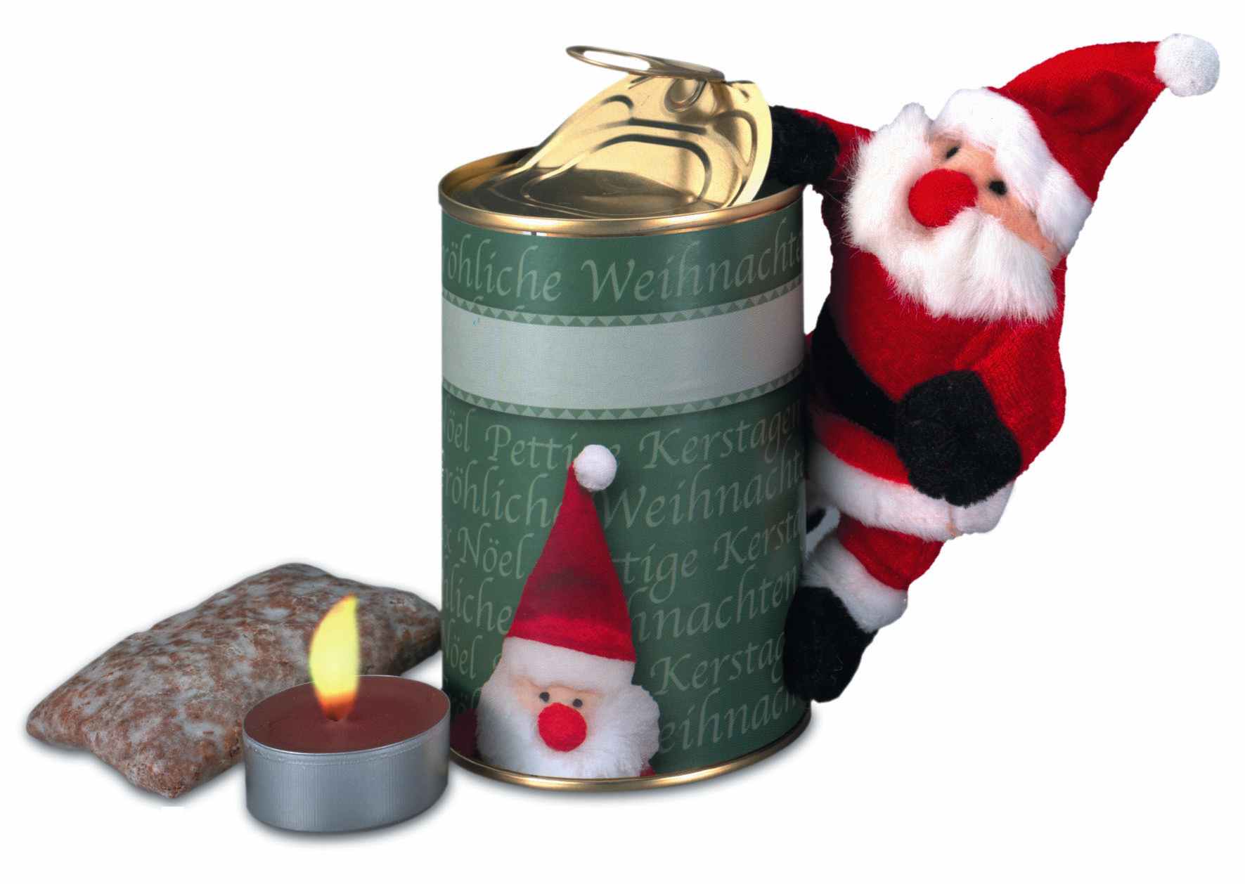 Beschreibung: Die Dose mit Aufreißdeckel enthält einen magnetischen Weihnachtsmann, Lebkuchen sowie ein Duft-Teelicht. Ein schönes Präsent zu Weihnachten. Platz für Ihren Werbeeindruck ist auf dem Standardmotiv der Banderole oder eine eigene Gestaltung, jeweils ab 100 Stück.