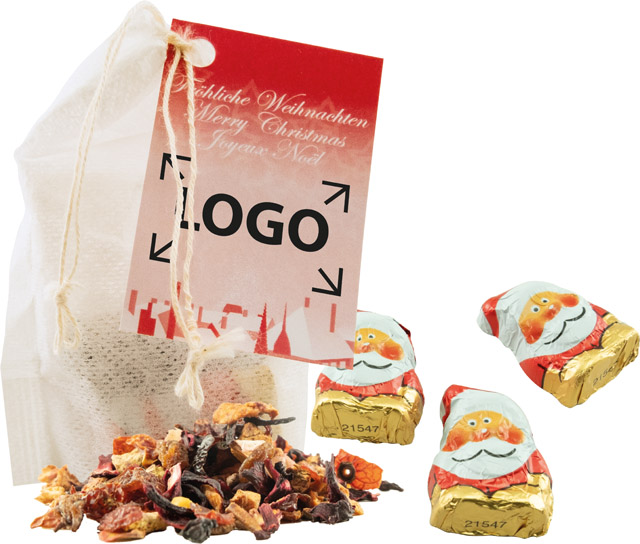 Inhalt: ca. 3 g Weihnachts-Früchtetee, 3 Schoko-Weihnachtsmännchen (je 5 g)