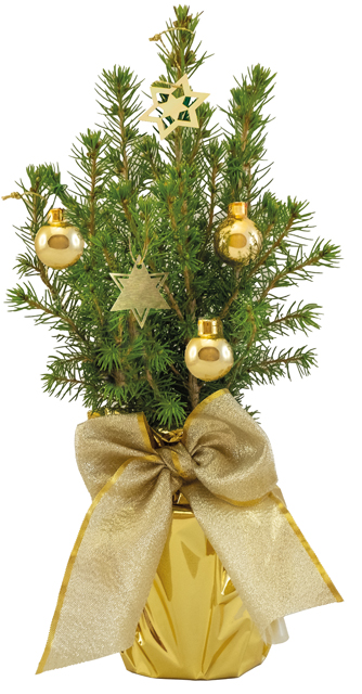Beschreibung: Eine lebende Zuckerhutfichte 20 - 30 cm, verpackt in einer Einzelversandkartonage, als kleines Bäumchen zu Weihnachten. Mit der goldenen Dekoration versetzt diese Zuckerhutfichte jeden Raum in eine weihnachtliche Stimmung. Das Bäumchen kann auf Wunsch von uns direkt an einzelne Empfänger versendet werden. Geschmückt ist das Bäumchen mit 3 goldenen Weihnachtskügelchen und 2 goldenen Sternanhängern. Deko für den Topf: Topffolie gold, Schleife gold. Die Farben Schleifen (rot, orange, blau, gold, silber) und Topffolien (gold, silber) sind beliebig kombinierbar. Ein Werbeeindruck kann auf unserem Anhängekärtchen Artikel 6202 (40 x 60 mm) ab 100 Stück erfolgen oder auf einer Beilage nach Wunsch. Zudem steht als Werbefläche ein separater Schuber, Art.-Nr. 4199-8, zur Verfügung.