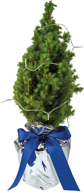 Inhalt: Bäumchen 35-45 cm geschmückt mit beigelegter Lichterkette (10 Lichter, ohne Batterien 2 x AA), Topffolie silber, Schleife blau