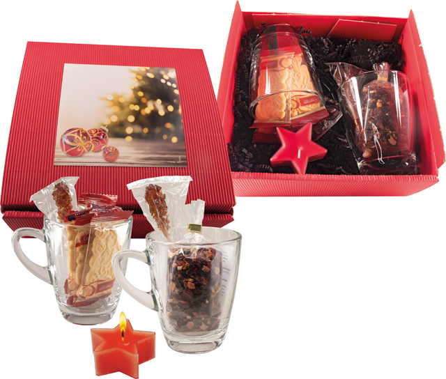 Beschreibung: So können Ihre Kunden eine besondere weihnachtliche Teestunde zu zweit genießen. Unser Set Tea For Two beinhaltet zwei Glastassen, zwei Kandisstangen, geschmackvollen Weihnachts-Früchtetee, leckere Butterspekulatius-Kekse sowie ein hübsches Sternlicht. Das Etikett im Standardmotiv kann mit Ihrem Logo versehen oder, ebenfalls ab 100 Stück, individuell gestaltet werden.