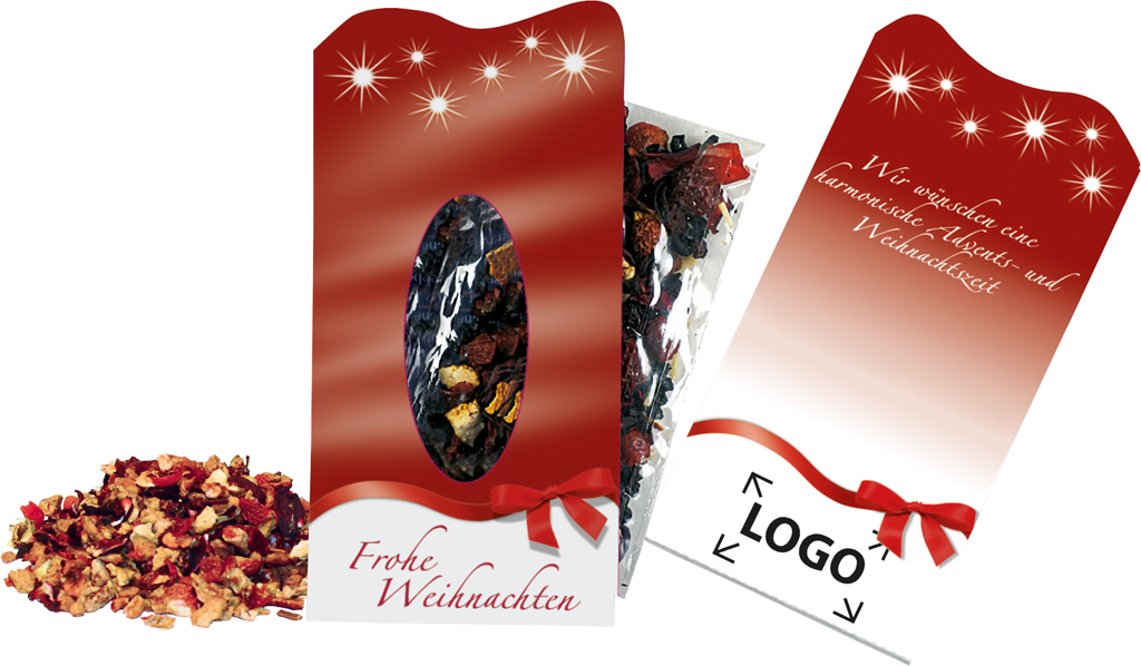 Beschreibung: Dieser köstliche Weihnachts-Früchtetee ist an langen Winterabenden immer eine Bereicherung. Das Teepäckchen enthält ca. 10 g Weihnachts-Früchtetee für ca. 5 Tassen. Platz für den Werbedruck ist auf dem Standardmotiv der Banderole oder eine eigene Gestaltung, jeweils ab 500 Stück.
