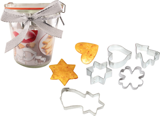 Beschreibung: Elegant und absolut praktisch: das Weckglas zum Verschließen mit 5 verschiedenen Ausstechformen (Baum, Herz, Stern, Komet, Kleeblatt) für die Weihnachtsbäckerei. So können die Ausstechformen geschützt aufbewahrt werden. Platz für den Werbedruck ist auf dem Standardmotiv des Einlegers oder eine eigene estaltung, jeweils ab 100 Stück.
