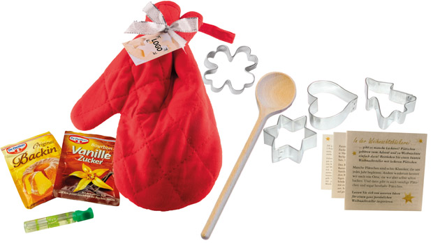 Beschreibung: Ideal für die weihnachtliche Backaktion ist unser Ofenhandschuh mit dem Rührlöffel, den Backzutaten und vier Backförmchen. Unsere ausgewählten Rezepte runden dieses sympathische und gleichzeitig praktische Präsent ab. Das Anhängekärtchen kann im Standardmotiv mit Ihrem Logo versehen werden oder, auch ab 100 Stück, komplett personalisiert werden.