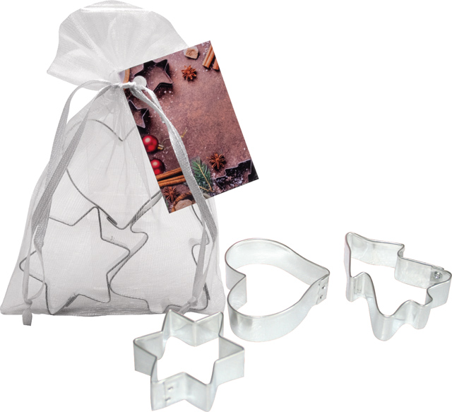 Beschreibung: Im hübschen Organzasäckchen befinden sich drei Backförmchen für Ihre Weihnachtsbäckerei. Die langlebigen und immer wiederverwendbaren Ausstechformen aus Weißblech, Made in Germany, sind ein sympathisches und nützliches Giveaway für Ihre Kunden. Ihr Werbeeindruck oder eine individuelle Gestaltung der Karte ist ab 250 Stück möglich.