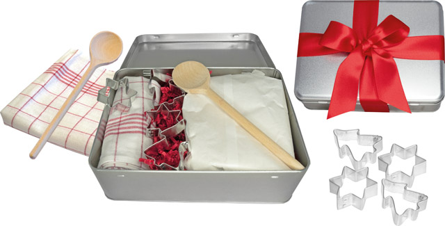 Beschreibung: Diese praktische Metalldose ist bestückt mit einer Backmischung, einem Geschirrtuch, einem Rührlöffel und vier Ausstechformen für die Weihnachtsbäckerei. Bereiten Sie Ihren Kunden eine Freude mit diesem schönen Set. Platz für den Werbedruck ist auf dem separaten Anhängekärtchen 6202 (40 x 60 mm) ab 100 Stück, auf einer separaten Karte aus unserem Sortiment oder Ihre Beilage nach Wunsch.