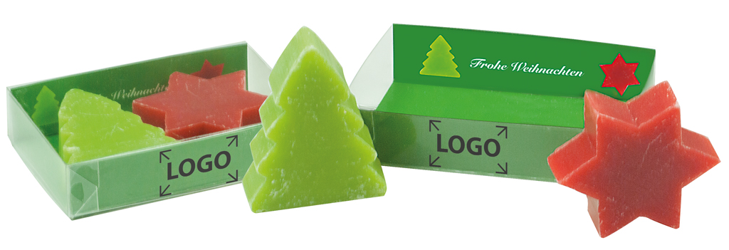 Beschreibung: Überraschen Sie Ihre Kunden zu Weihnachten mit diesen hochwertigen Schafmilchseifen in Form eines Sterns und eines Tannenbaumes. Die natürlichen Zutaten Schafwollfett und Schafmilch sind eine Wohltat für die empfindliche Haut. Im Standardmotiv auf dem Einleger kann Ihr Werbeeindruck ab 250 Stück erfolgen. Eine individuelle Gestaltung ist ebenfalls ab 250 Stück möglich.