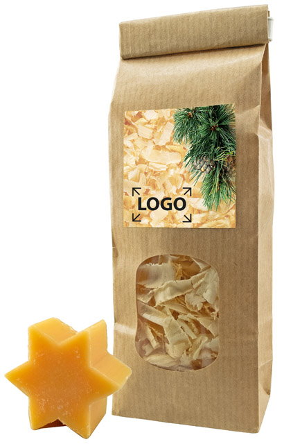 Beschreibung: Die ätherischen Wirkstoffe des Zirbenholzes fördern das Wohlbefinden. Das Etikett kann im Standardmotiv mit einem Logo versehen, oder, ebenfalls ab 250 Stück, individuell gestaltet werden.