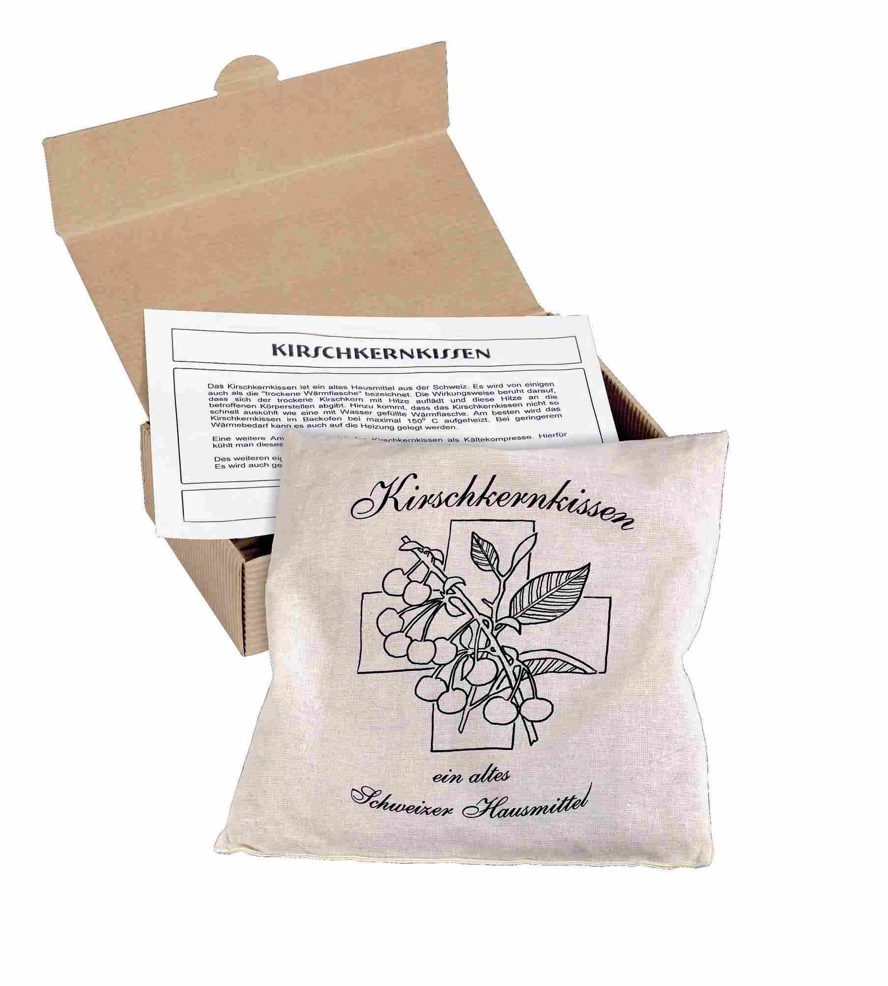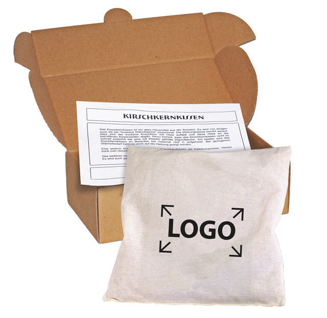 Beschreibung: Kirschkernkissen nach dem Ursprung des altbewährten Schweizer Hausmittels. Der Natur-Baumwollstoff kann ab 100 Stück bedruckt werden. Andere Abmessungen auf Anfrage sind möglich. Das Standardkissen im Format 24 x 24 cm ist der ideale Wärmebringer. Schön geschützt verpackt im Präsentkarton.