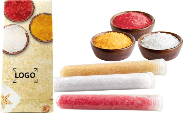 Beschreibung: Die drei Badesalze verwöhnen den Körper und ihre Aromen inspirieren die Sinne. Platz für den Werbedruck ist auf dem Standardmotiv der Packung. Eine eigene Gestaltung ist bereits ab 250 Stück möglich