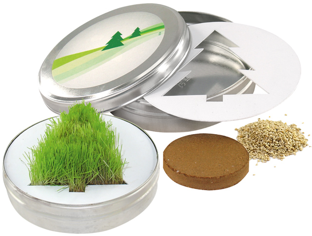 Description: An other kind of Christmas Tree. The metal box with fir tree stencil, compressed soil and grass seeds. Open the box, sow the seeds according to instructions and after a few days the Christmas Tree will be green. ‘Cut‘ the lawn in order to maintain the shape visible. Individual design of the shape or logo on demand starts with 1.000 pieces. The lid label offers enough space for your advertising. Your individual design starts with 250 pieces.